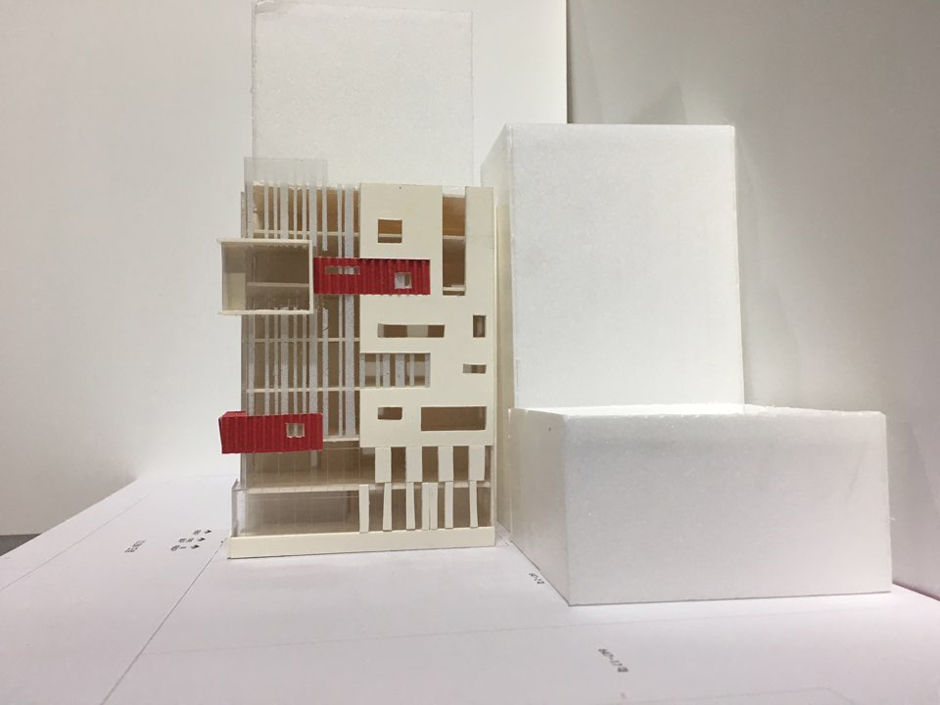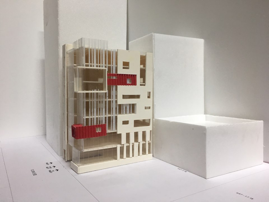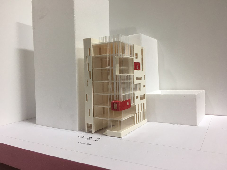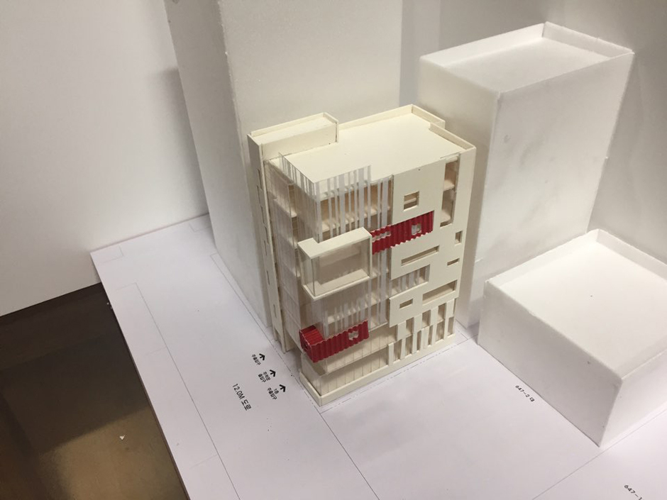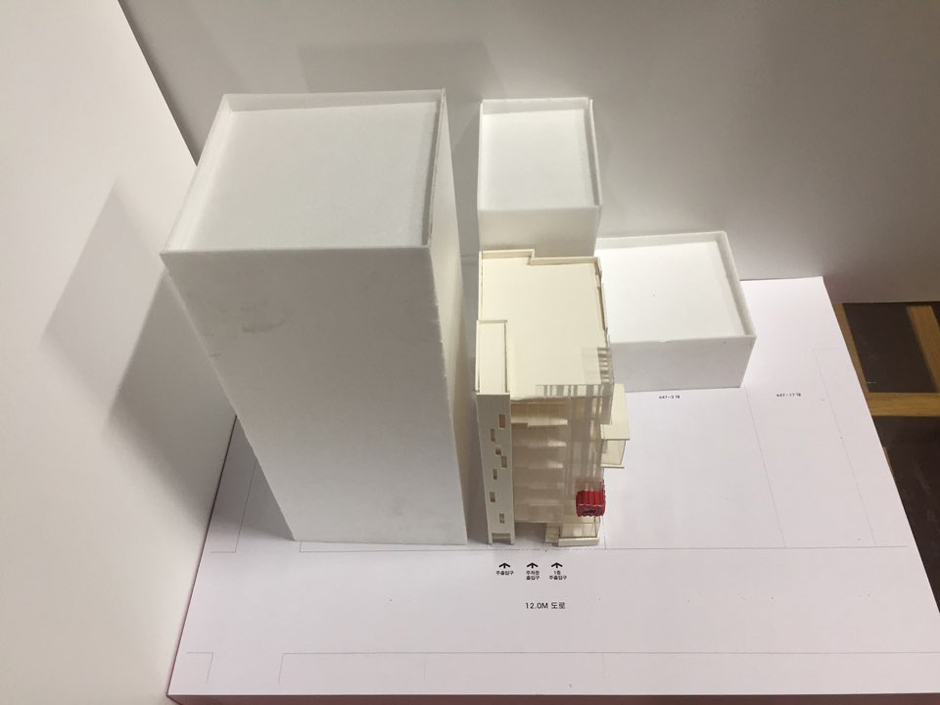설명 | 설계 의뢰를 받고 보니 일전에 금고 입점이 적합하지 않다고 검토 해 준 부지였다. 남북으로 긴 장방형의 형태로 대지폭이 10m 남짓하여 접근성, 인지성, 영업장 배치 등 어느 하나 충족시키지 못한 부지라 판단했었다. 계획전부터 안 된다고 생각하다 보니 어려운 숙제를 받은 느낌이었다. 금고의 요구 조건은 2층 규모에 연면적 500㎡, 노인들의 접근성이 좋아야하고, 최저의 공사비, 촉박한 설계기간 등이었다. 첫 계획안을 보고서에 모형까지 완료하였으나 주차장 강당 등 아쉬운 부분이 너무 많았다. 건축주의 재촉으로 재계획을 하기엔 부담스러웠지만 고민 끝에 새로운 안을 만들기로 결정했다. 1층은 필로티로 하여 주차장으로 사용하고 사용빈도가 가장 높은 365코너만 배치하였다. 2층은 영업장과 객장, 3층은 사무공간, 직원 휴게실, 4층과 강당으로 계획하였다. 접근성 문제는 3m폭의 넓은 진입계단과 1층에서 승강기를 탑승할 수 있도록 하여 노약자의 불편을 해소 하고자 하였다. 외부디자인은 기능이 부여된 계단 매스와 영업장 부분의 매스를 두 개로 나누어 재료를 입히니 자연스럽게 디자인이 되었다. |